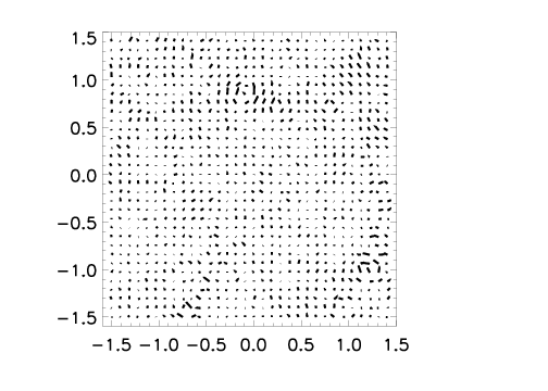 A shear map, 3 degrees on a side, coarsely sampled. This is the first of 4 panels illustrating aperture masses. Note the tangential signals around mass peaks in the map.