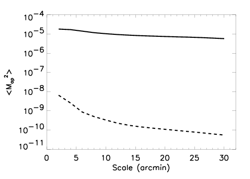 The variance of the aperture mass, computed from the shear map of the previous plot, as a function of scale. The solid line is the E-mode (computed using gamma_+) while the dashed line is the B-mode (computed using gamma_x). Note that due to lens-lens coupling and other higher order effects the B-mode from lensing is not zero, just small.