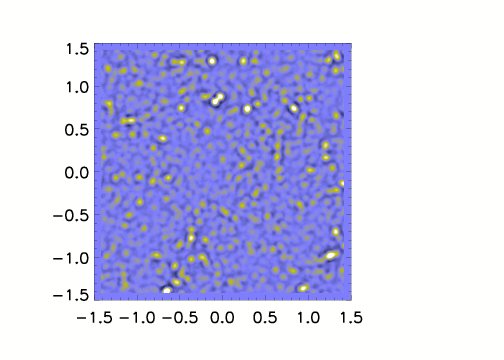 A slice, 100Mpc/h on a side, through an N-body simulation, showing that clusters form at the intersection of a beaded filamentary network. The region around clusters is typically more dense than an average region of the universe, and multiple smaller halos (associated with the cluster) can be seen.